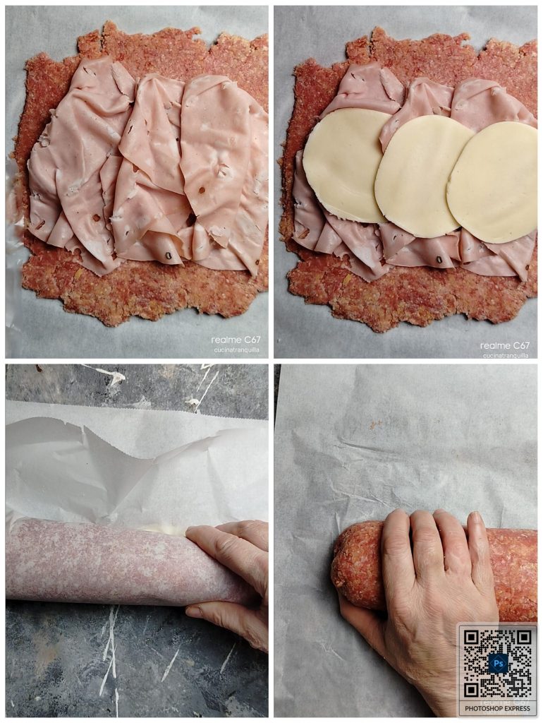 Ajuste a base de carne moída com uma faca para torná-la mais uniforme em todos os lados e comece a rechear com as fatias de mortadela e queijo caciotta, tomando cuidado para deixar as bordas livres.
