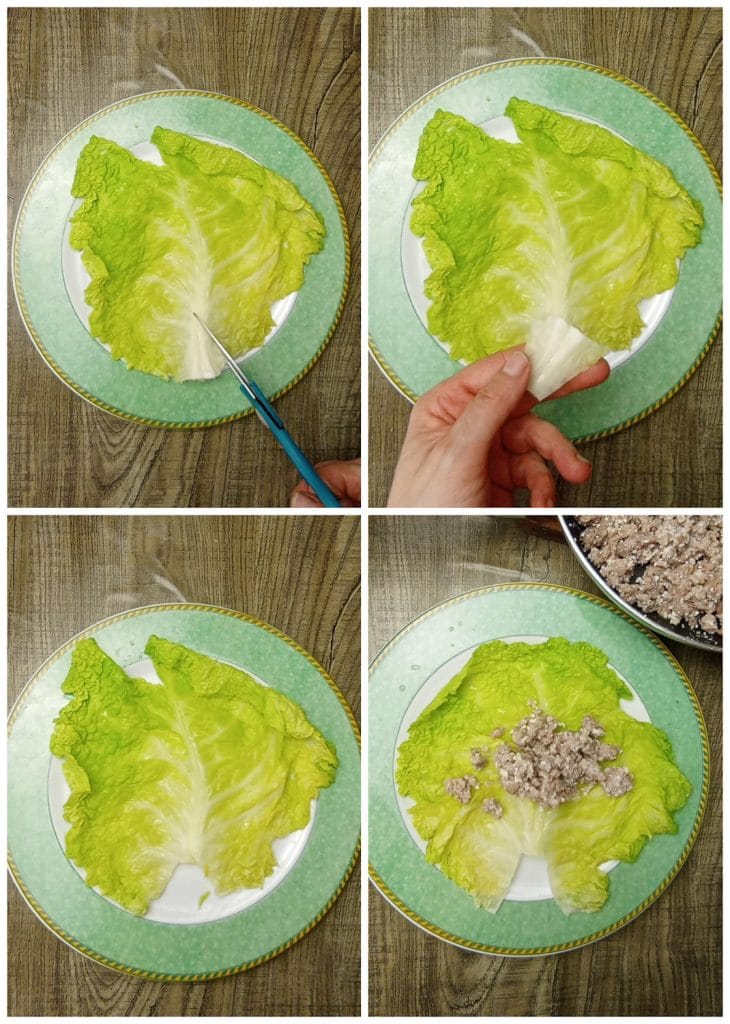 Para preparar os rolinhos de repolho com linguiça e parmesão, enriquecidos com ricota salgada, primeiro retiramos do repolho 8 belas folhas grandes e inteiras.