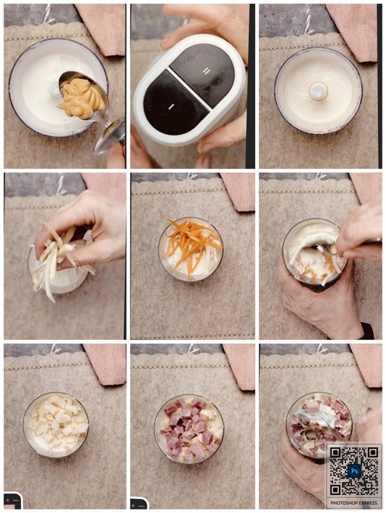 Adicione à mistura o aipo-rábano e a cenoura escorridos e secos com um pano, o queijo e o presunto cozido e misture bem.