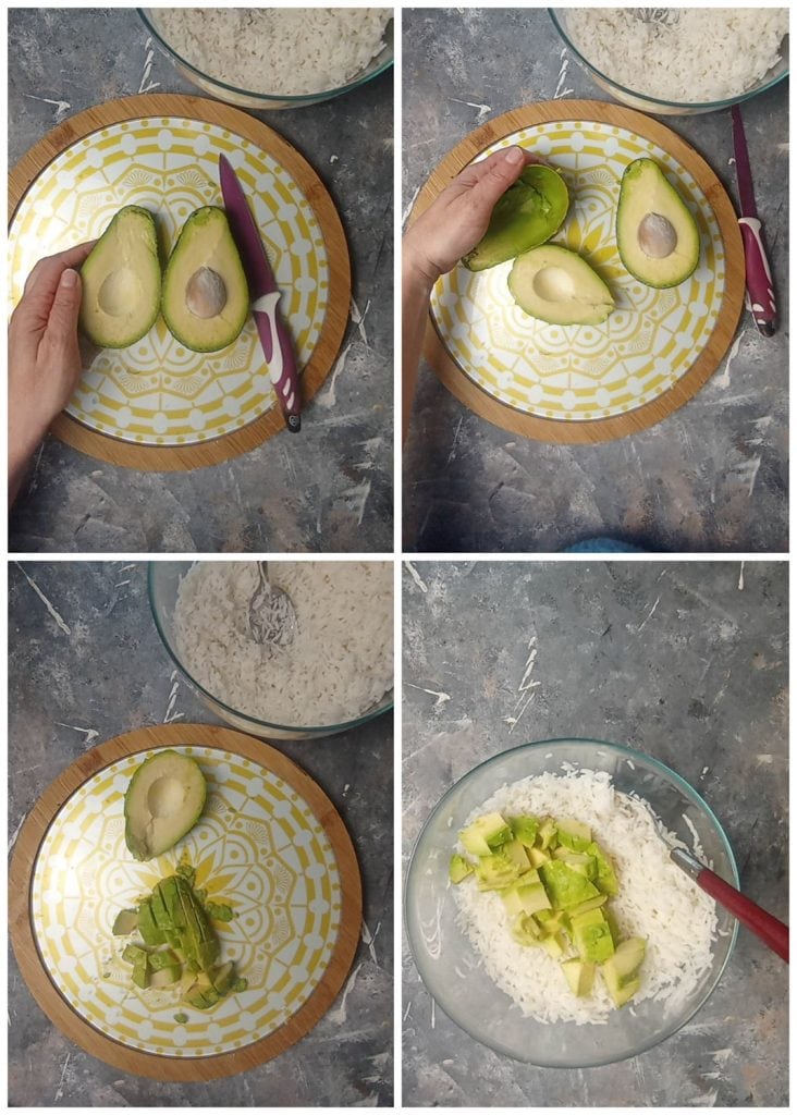 Para preparar a Salada de arroz basmati com manga e abacate, primeiro cozinhamos o arroz e deixamos escorrer bem. Uma vez morno, colocamos em uma tigela para descansar com um fio de óleo.