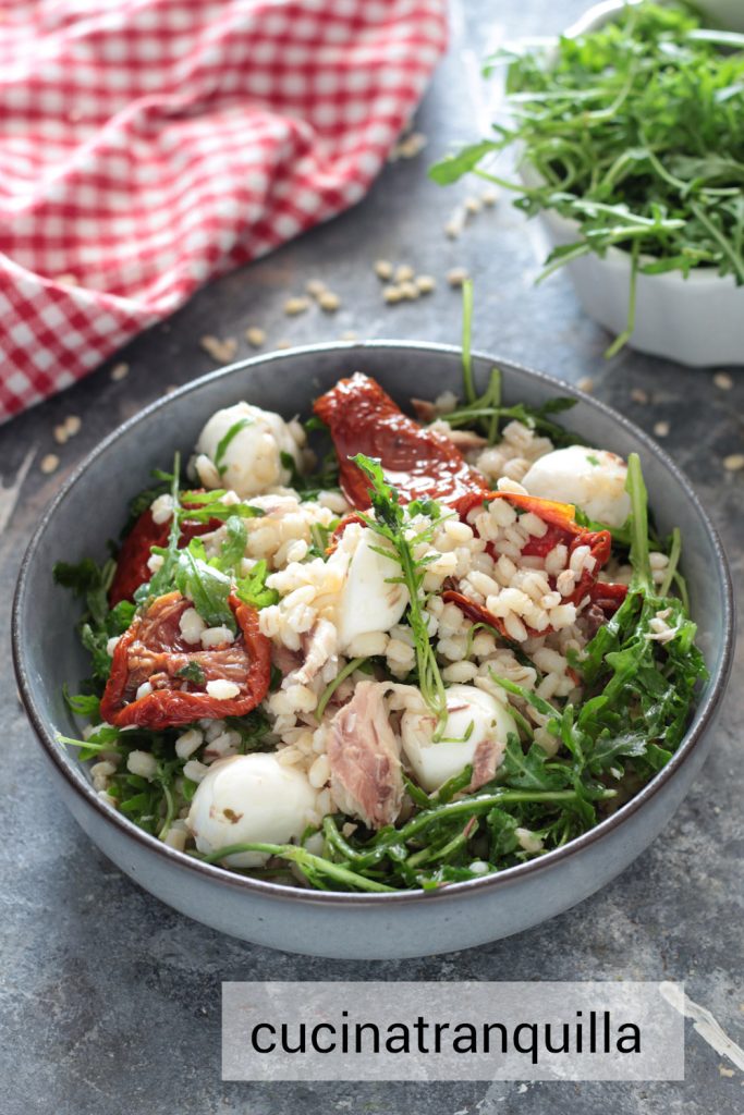 Salada de cevada com cavala e tomates secos, fresca e deliciosa, facilíssima de fazer.