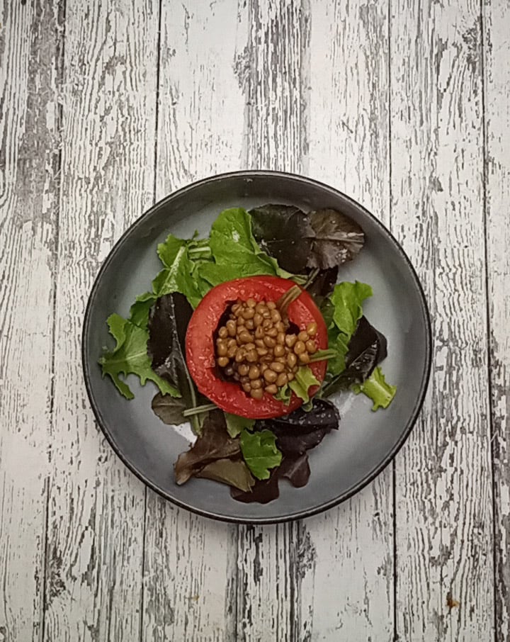 Recheamos o tomate com um pouco de salada e adicionamos duas colheres de lentilhas.