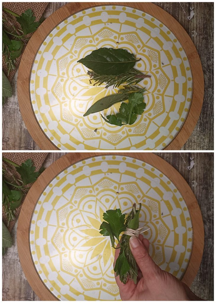 Lave e seque as folhas das ervas aromáticas e amarre-as com um barbante.
