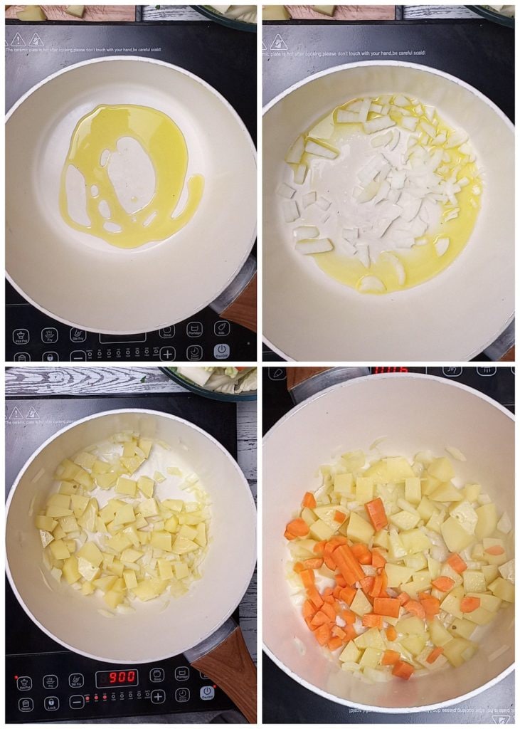 • Em uma panela grande, refogue a cebola no azeite e adicione, após alguns minutos, a cenoura e as batatas. Prossiga o cozimento por 3 minutos, mexendo sempre, em fogo baixo.