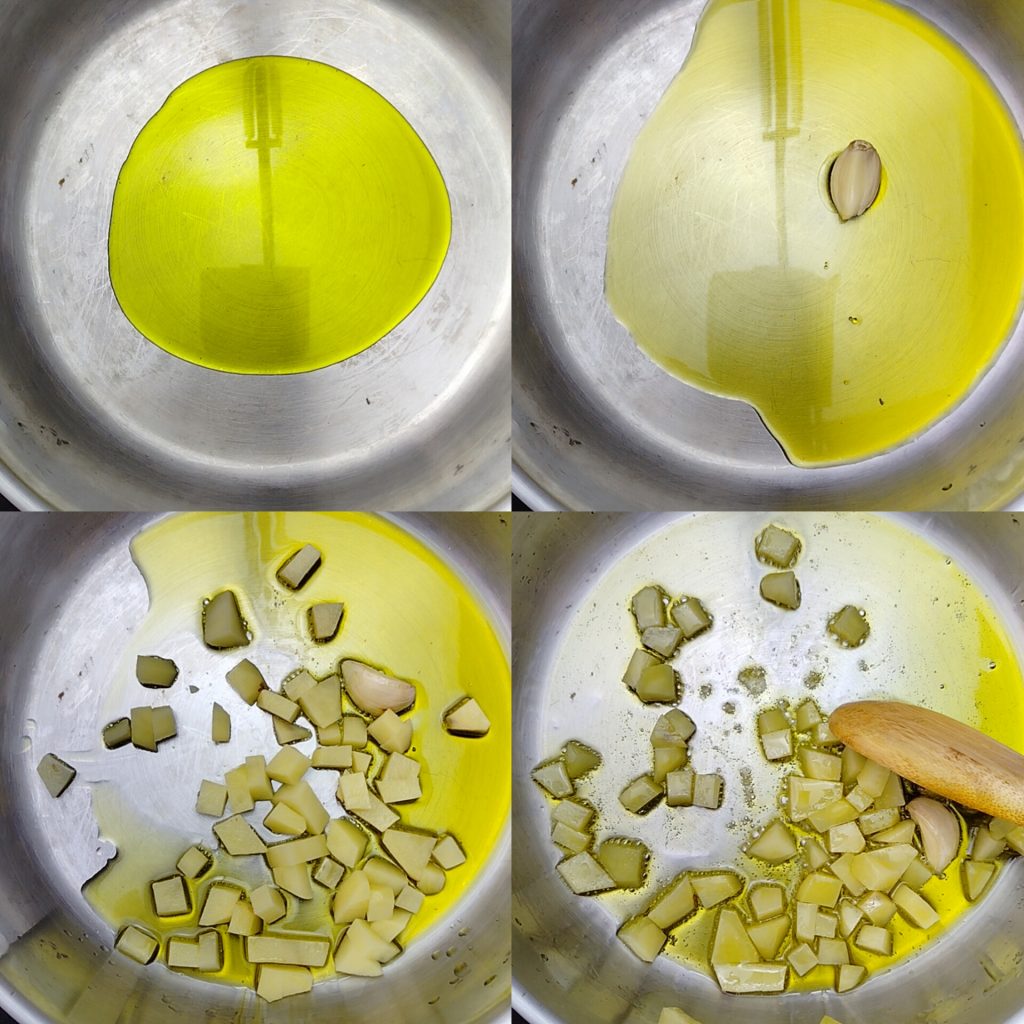 Para fazer a Sopa de lentilhas vermelhas e batatas, aqueça em uma panela o azeite de oliva extra virgem e doure o alho sem casca. Adicione as batatas previamente descascadas, lavadas, secas e cortadas em cubinhos pequenos para facilitar o cozimento. Cozinhe por 3 minutos em fogo baixo, mexendo sempre.