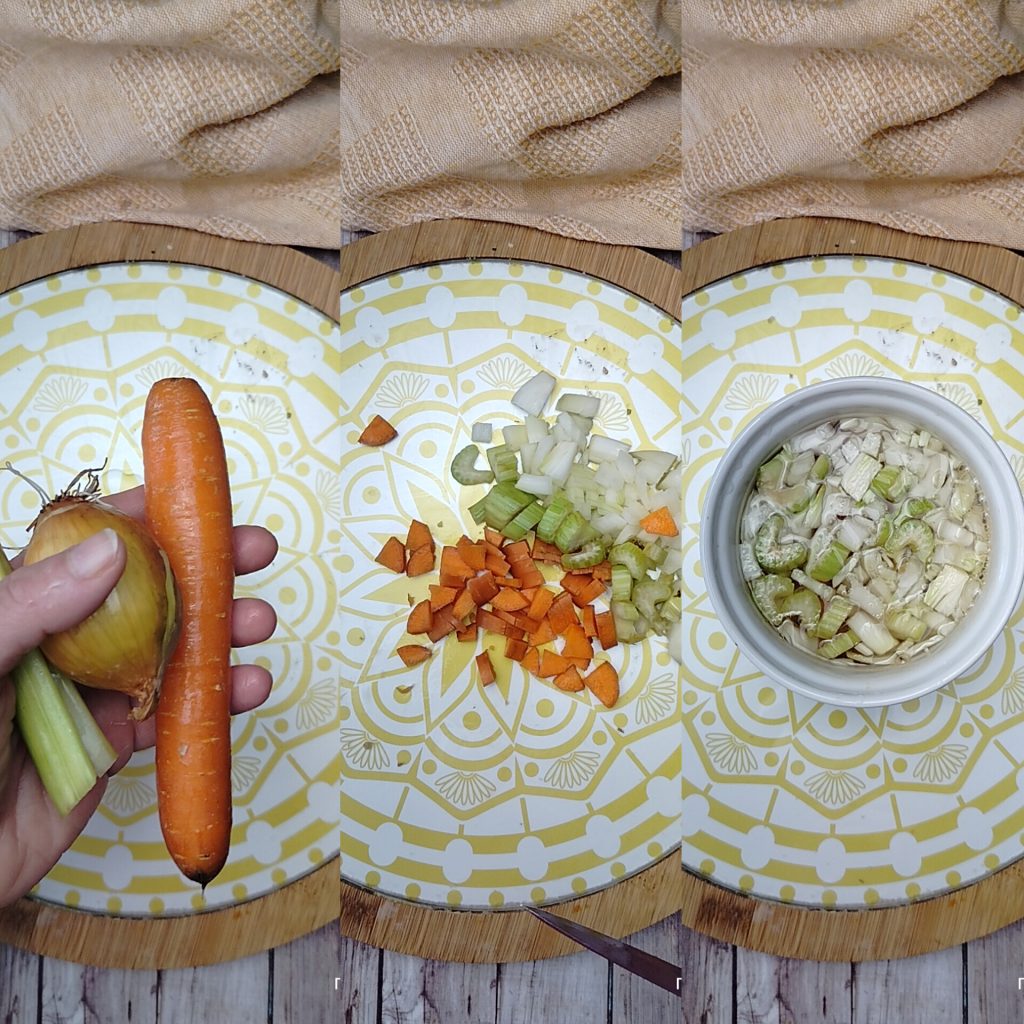 Enquanto isso, prepare a base para o refogado limpando o salsão, a cenoura e a cebola e cortando-os em pedaços pequenos. Deixe-os de molho em uma tigela com água fria. Desta forma, eles permanecerão frescos e a cebola não fará você lacrimejar na hora do cozimento.
