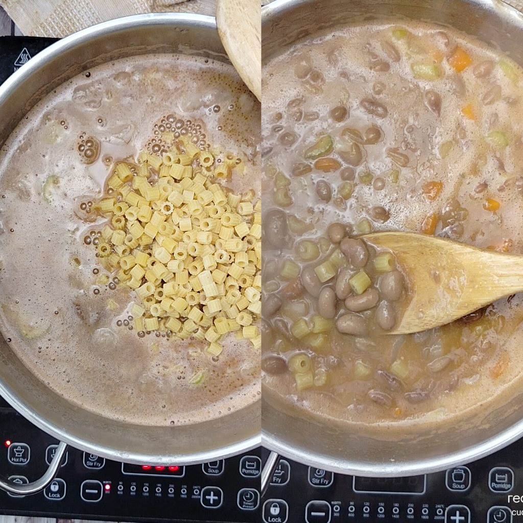 Neste ponto, continuando o cozimento sempre em fogo baixo, adicione o macarrão, mexendo frequentemente com uma colher de pau, até que esteja completamente cozido. Apenas tome cuidado para não deixar grudar no fundo da panela. Se perceber que a parte líquida diminuiu muito, antes de adicionar o macarrão, não hesite em adicionar um pouco mais de água, levando novamente à fervura.