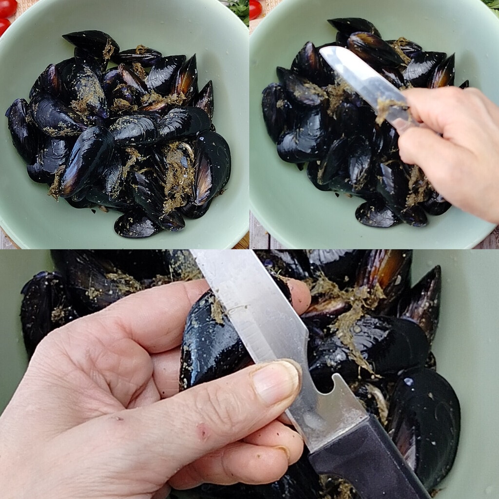 Para fazer a sopa de mexilhões ao tomate, primeiro limpe bem os mexilhões. Primeiro, após abrir a rede dos mexilhões, elimine os quebrados para evitar que pedaços de cascas quebradas caiam na sopa e comprometam o resultado final. Com uma faca afiada, com cuidado, arranque a barba com um movimento decidido da parte pontuda em direção à base. Raspe a casca eliminando as impurezas o máximo possível e, depois de concluir essa operação, lave bem os mexilhões em água corrente fria.