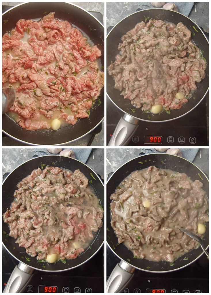 • Regue com o vinho branco e continue mexendo para separar bem a carne.