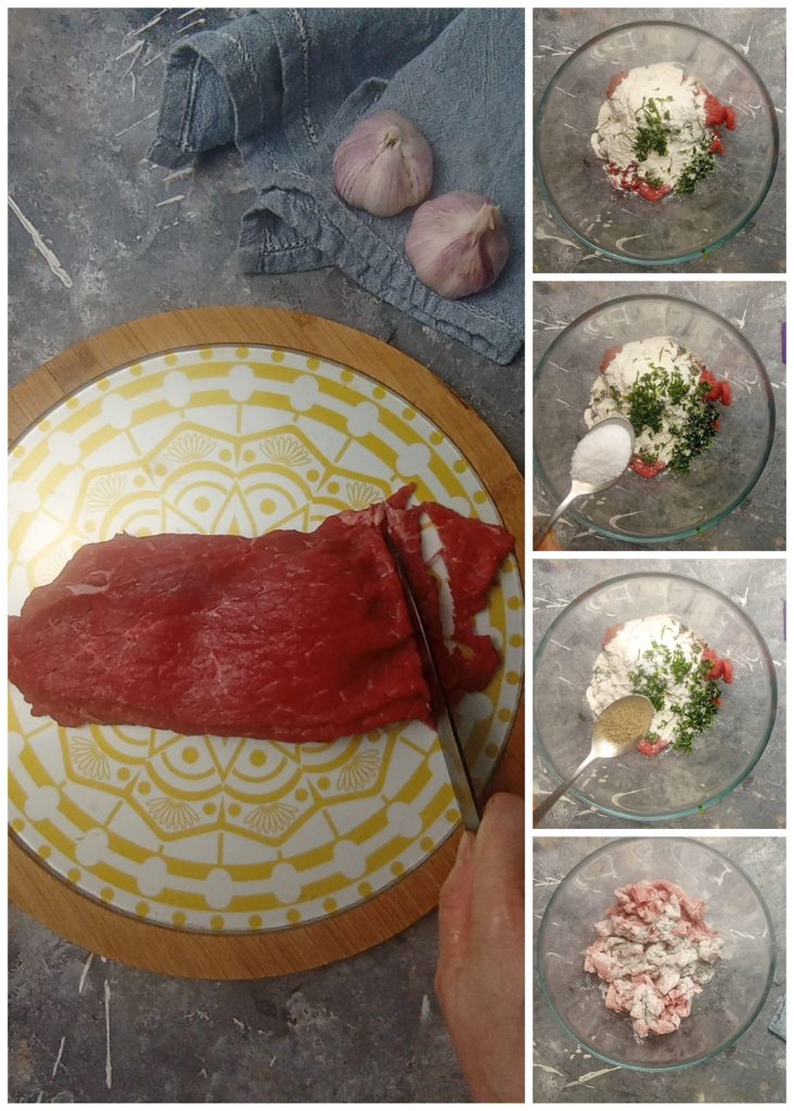 • Para preparar as Tiras de carne bovina ao vinho branco e limão, primeiro corte as fatias de carne bovina em tiras.