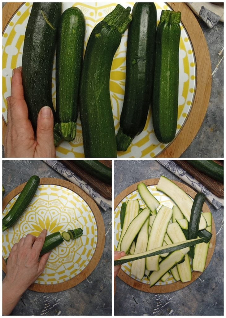 • Para preparar a Torta de abobrinha e peito de peru sem pré-cozimento, primeiro lavamos, cortamos as pontas e fatiamos as abobrinhas finamente como na foto.