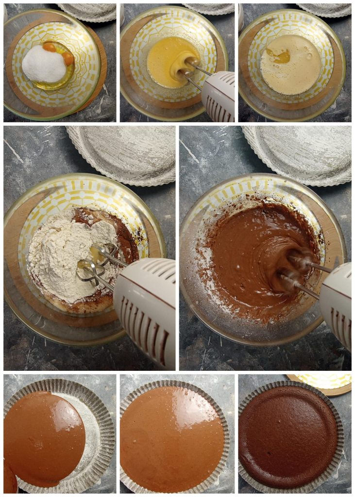 Depois adicione a água à temperatura ambiente, o óleo de girassol, o cacau em pó, o fermento para bolos e, finalmente, a farinha.