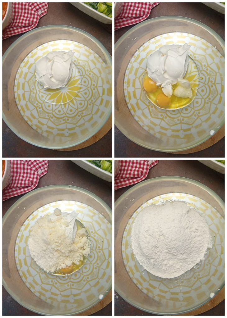 • Dentro de uma tigela, junte o mascarpone com os ovos, o queijo ralado e o sal.