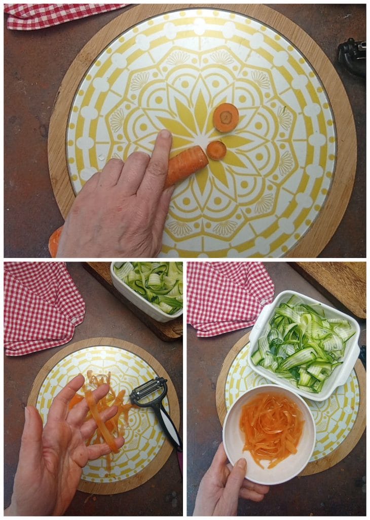 • Corte também as extremidades da cenoura, descasque e corte-a em fatias finas, como a abobrinha.