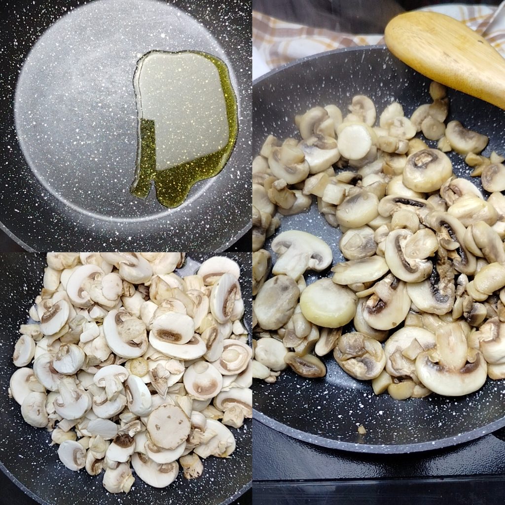 • Para fazer a Torta rústica de ricota com cogumelos e peito de frango, primeiro cozinhe os cogumelos previamente limpos e cortados em fatias finas em um pouco de azeite de oliva extravirgem. Serão necessários 8-10 minutos de cozimento, pois depois continuarão a cozinhar na torta rústica. Deixe esfriar.