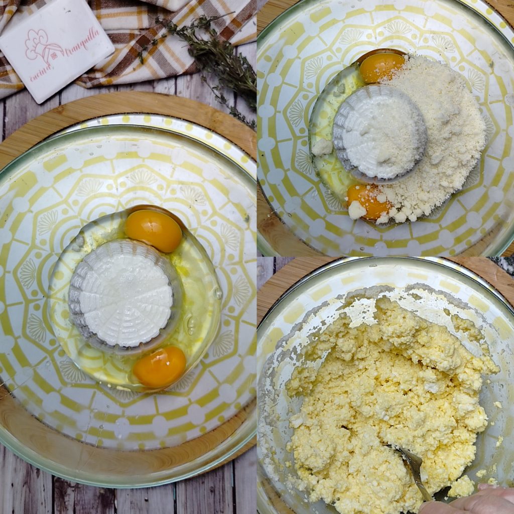 • Enquanto isso, em uma tigela, misture metade do queijo ralado com a ricota e os ovos. Adicione uma pitada de sal, se desejar, e misture até obter uma mistura relativamente homogênea. Não será cremosa, mas ficará um pouco solta, e deve ser assim.