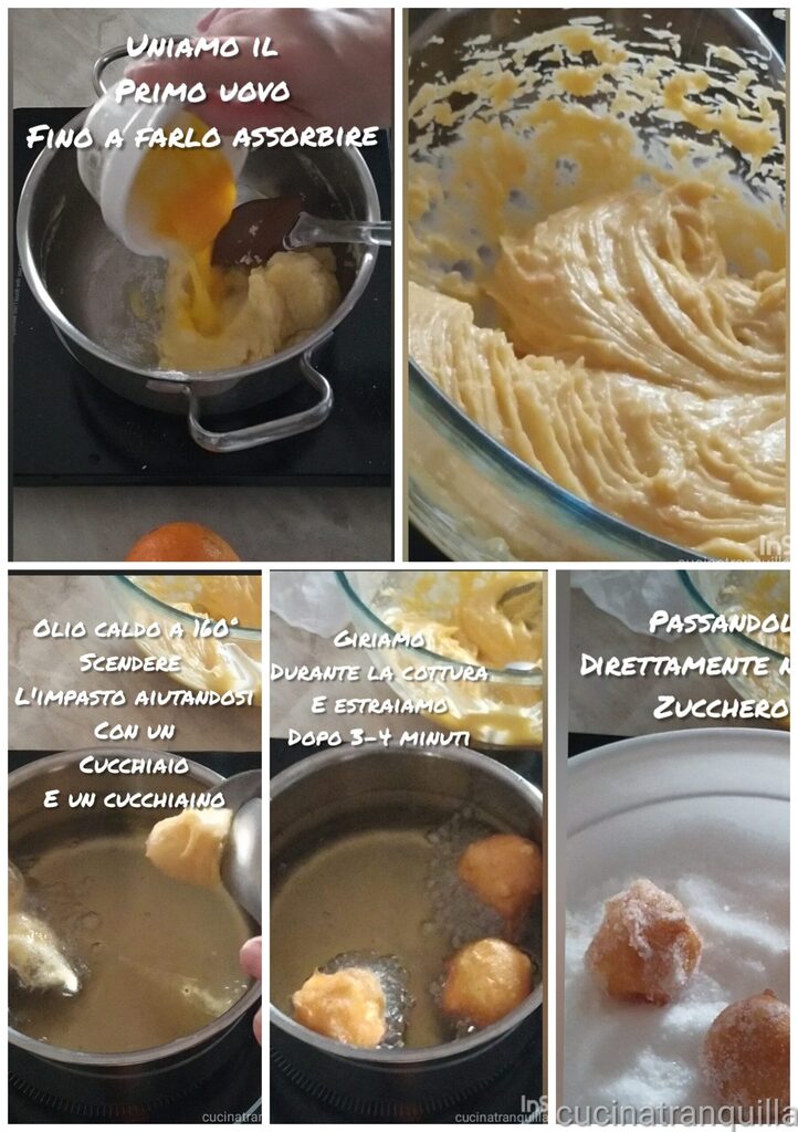 Adicionamos o primeiro ovo garantindo que seja bem absorvido e juntamos o segundo, trabalhando energeticamente (também com a ajuda de uma batedeira elétrica, se necessário). O resultado final deverá ser um creme bastante firme. Levamos o óleo de sementes à temperatura de 160° ajudando-nos com um termômetro de cozinha. Despejamos a massa com a ajuda de uma colher grande e uma pequena e douramos bem os tortelli, girando-os frequentemente e cozinhando-os por 3-4 minutos. Eles devem ser inflados e quase vazios por dentro, bem cozidos. Retiramos com uma espumadeira, escorrendo bem, e passamos diretamente no açúcar.