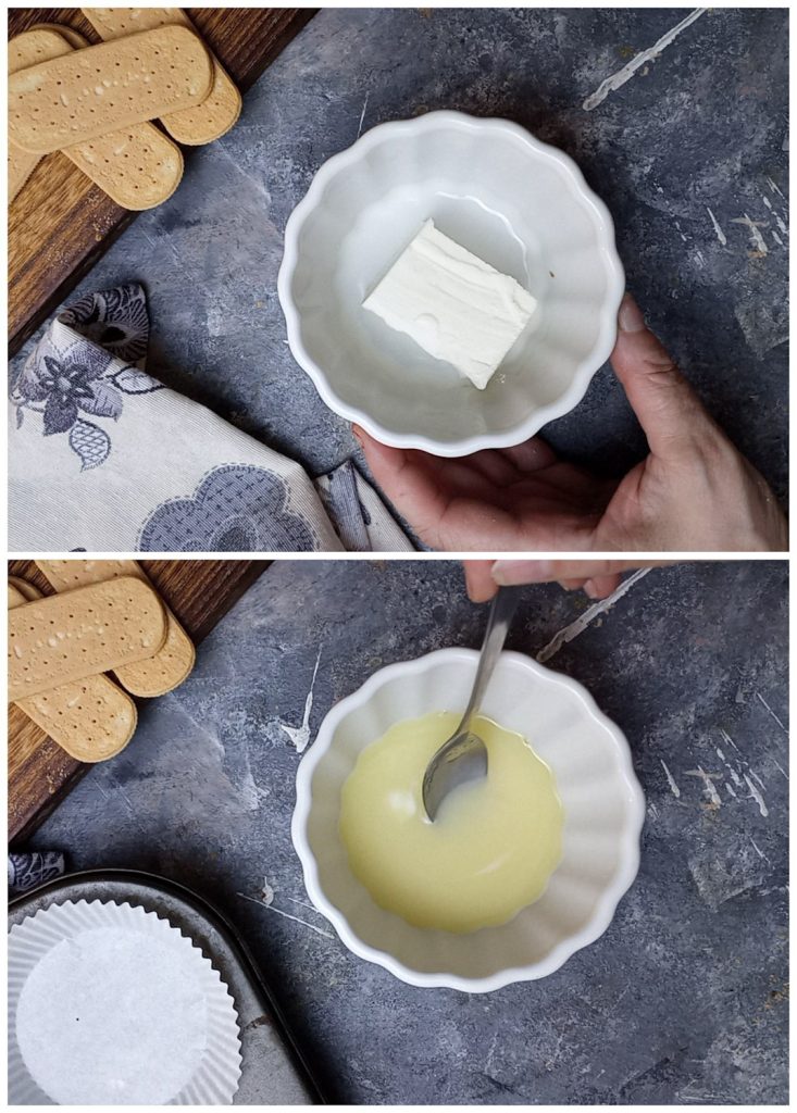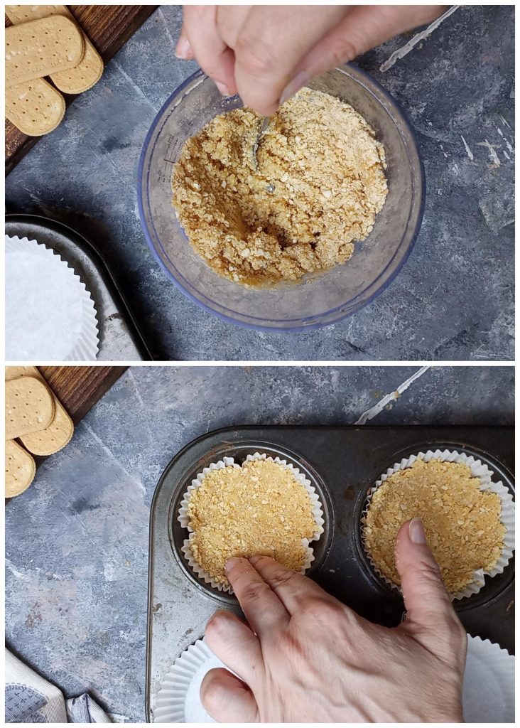 • Dentro de uma tigela, misturamos muito bem a manteiga com os biscoitos triturados.