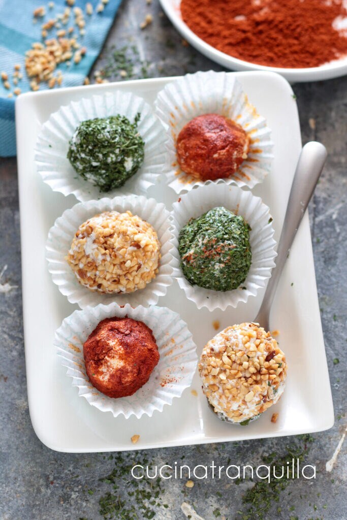 Trufas salgadas receita fácil sem cozimento, uma ideia para um aperitivo fácil e delicioso à base de queijo fresco, ótimas para um aperitivo em qualquer ocasião. Com sua frescura, vão conquistar você especialmente nas noites quentes de verão e são perfeitas também para decorar a mesa de Ferragosto ou de qualquer outra festa, mesmo informal. Os ingredientes que escolhi para esta receita são facílimos de encontrar e, nas perguntas abaixo que de vez em quando me fazem, ao final da receita, você encontrará também algumas alternativas aos meus produtos. Mesmo aqui, como sempre, sinto-me à vontade para deixar uma pequena dica. Na verdade, você pode escolher a ricota que preferir, mesmo de ovelha, mas quanto mais seca ela for, melhor será este aperitivo. Caso esteja muito mole, você pode deixá-la no refrigerador por cerca de 30 minutos, para que perca o máximo de soro possível. Nesta receita, quanto mais longos forem os tempos de repouso, melhor será, obviamente dentro do limite do possível. Se gosta de preparar estas deliciosas receitas sem cozimento, abaixo deixo algumas ideias para fazer trufinhas doces ou salgadas.