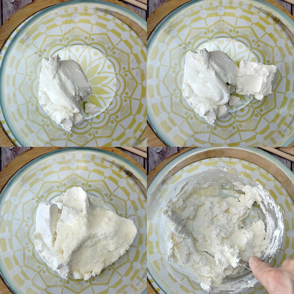 Com um queijo cremoso tipo Philadelphia. Se a consistência parecer muito cremosa e não trabalhável, adicione um pouco de queijo ralado de cada vez, até obter uma mistura que possa ser moldada