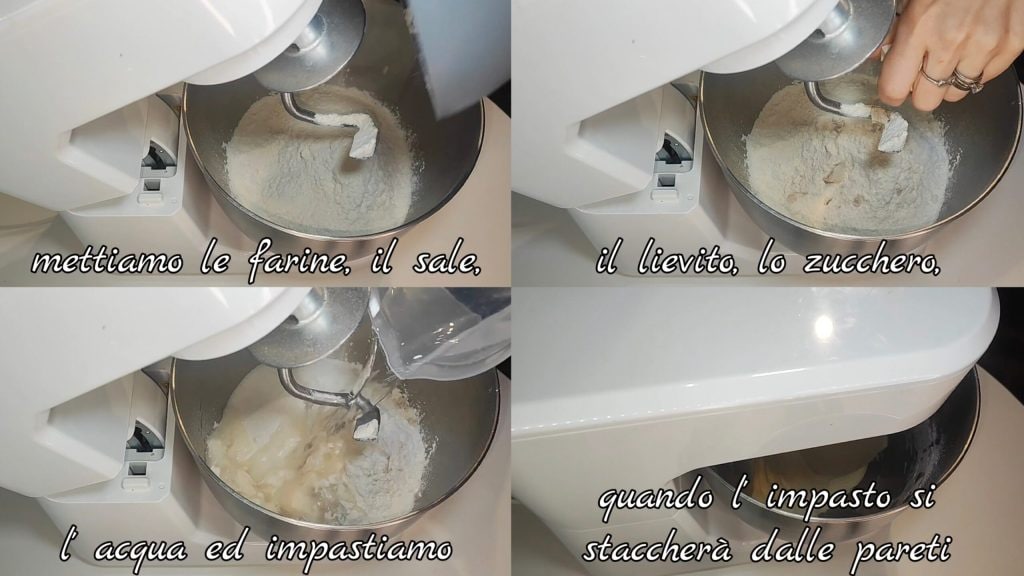 Colocamos as farinhas, o sal, o fermento, o açúcar, a água e amassamos. Quando a massa se desgruda das paredes