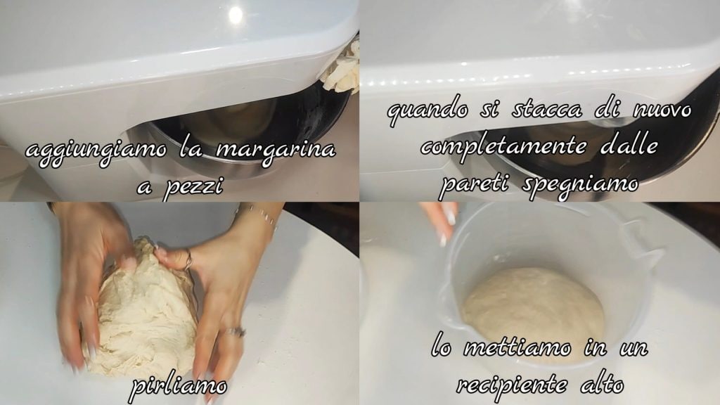 adicionamos a margarina fria em pedaços. Incorporamos bem e quando se desgruda novamente das paredes desligamos. Fazemos algumas dobras e boleamos. Colocamos em um recipiente alto.