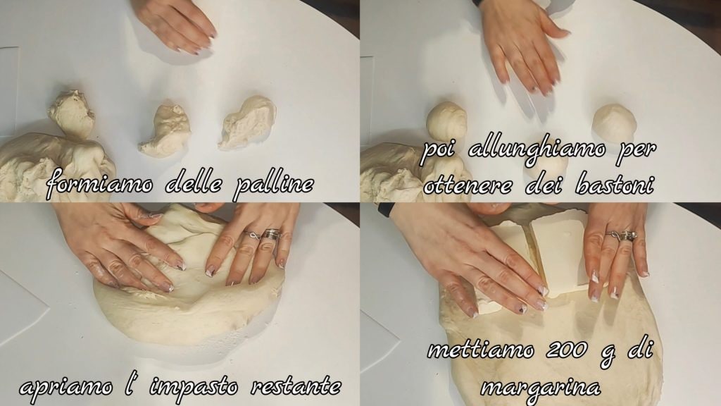 Formamos bolinhas e depois as alongamos para obter palitos. Abrimos a massa restante e colocamos a margarina (200 g),
