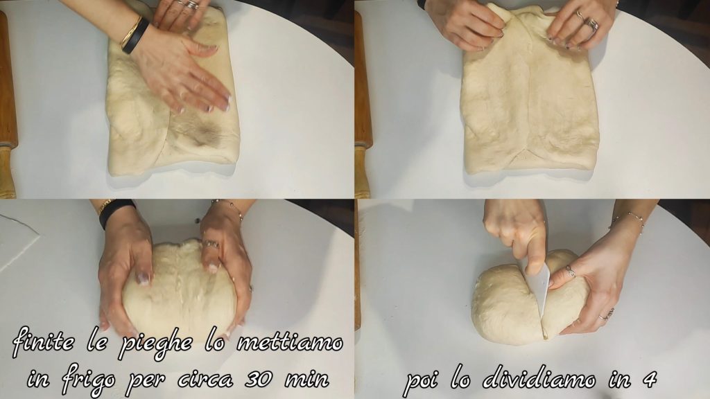 Terminadas as dobras colocamos na geladeira por cerca de 30 min, depois dividimos em quatro.