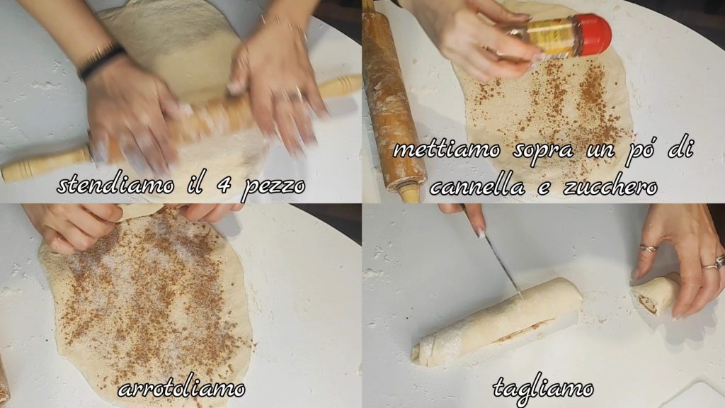 Estendemos o quarto pedaço e colocamos por cima um pouco de canela e açúcar, enrolamos e depois cortamos em pedaços.