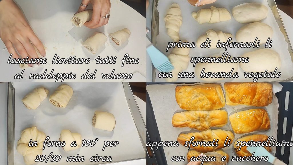 Deixamos fermentar todos até dobrar de volume. Antes de assá-los, pincelamos com uma bebida vegetal. Assamos a 180° por cerca de 20/30 min. Assim que saírem do forno, pincelamos com um pouco de água e açúcar.