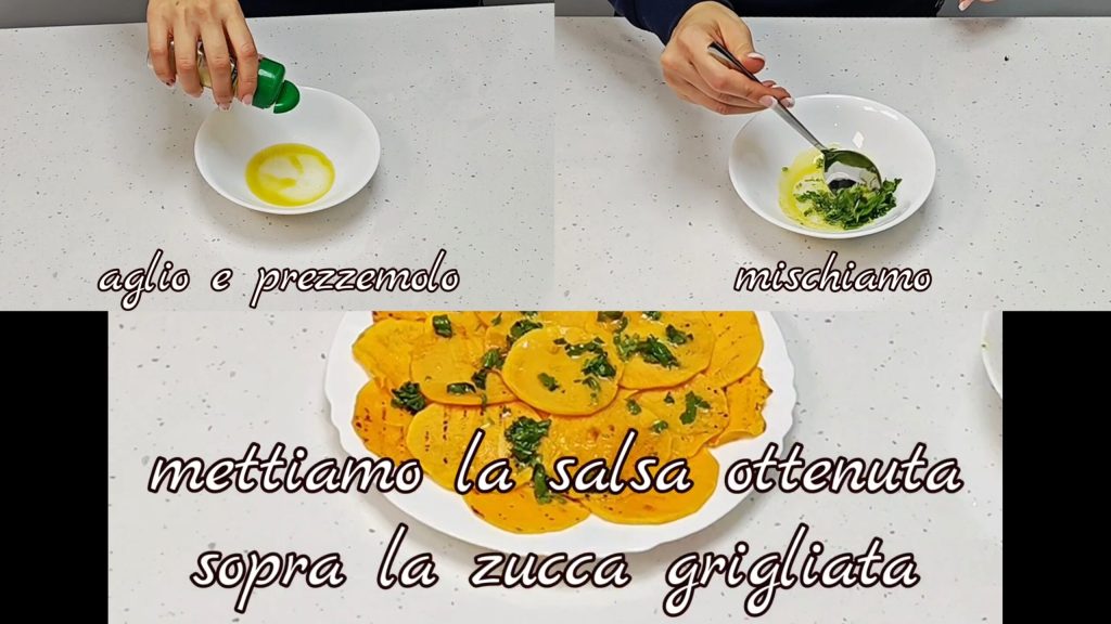alho, salsa e misturamos bem. Colocamos o molho obtido sobre a abóbora cozida e deixamos marinar por alguns minutos na geladeira!