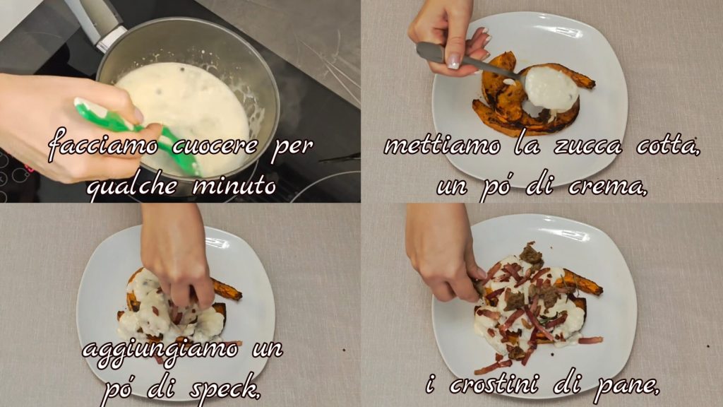 cozinhamos por alguns minutos. Em um prato, colocamos as fatias de abóbora cozidas. Adicionamos por cima o molho de queijo preparado, um pouco de speck, os croutons de pão