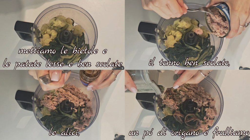 Colocamos a acelga e as batatas cozidas bem escorridas, o atum escorrido, as anchovas, um pouco de orégano e batemos.