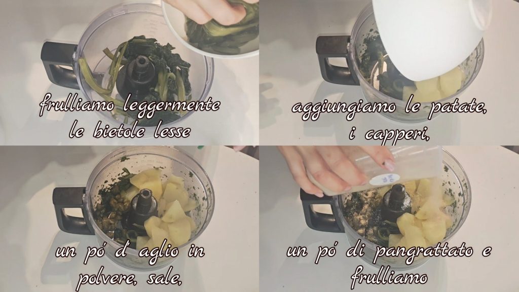 Primeiro, batemos no liquidificador as acelgas cozidas e bem escorridas, adicionamos as batatas também cozidas e escorridas, um pouco de alho, sal, alcaparras, farinha de rosca e batemos novamente.