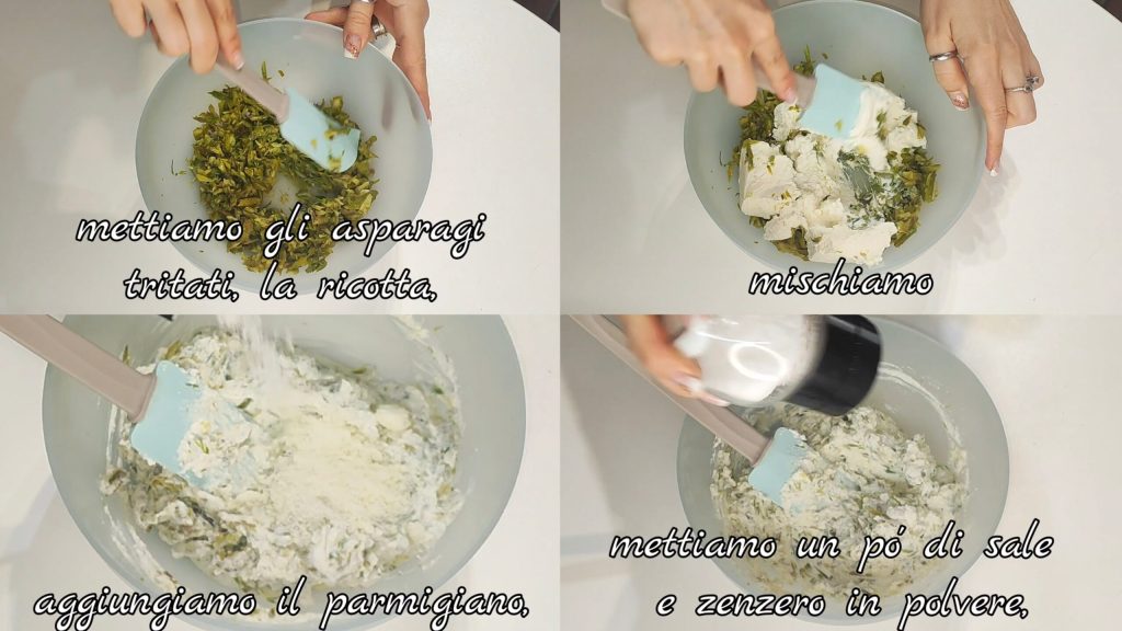 Em um recipiente, colocamos os aspargos picados, a ricota e misturamos. Adicionamos o parmesão, um pouco de sal e gengibre em pó.