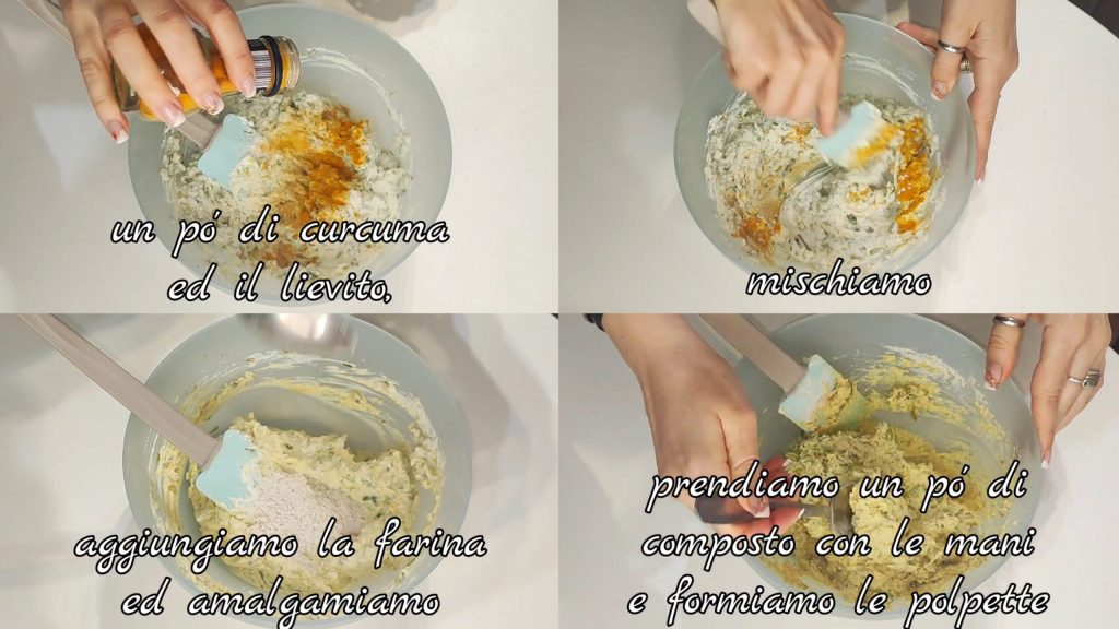 Adicionamos um pouco de cúrcuma e o fermento e misturamos. Adicionamos a farinha e misturamos tudo. Pegamos um pouco da mistura com as mãos e formamos as almôndegas.