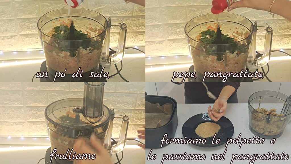 Adicione um pouco de sal, pimenta, farinha de rosca e bata novamente para misturar bem tudo. Forme as almôndegas pegando um pouco da mistura de cada vez e modele com as mãos, depois passe na farinha de rosca.
