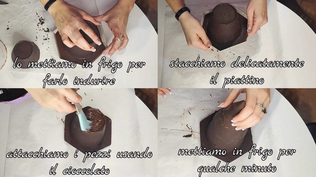 • Coloque na geladeira para endurecer. Depois, retire delicadamente o pratinho. Una as outras partes usando chocolate. Coloque na geladeira por alguns minutos.