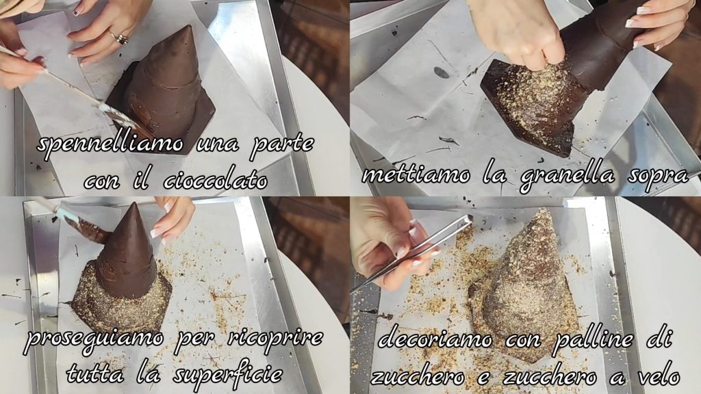 Uma ideia de presente de Natal muito legal para os nossos entes queridos que podemos fazer facilmente usando objetos que temos em nossas casas. Eu, para fazer a árvore, usei dois recipientes de plástico de tamanhos diferentes (na verdade, esses são aqueles encontrados dentro dos ovos de Páscoa) e fiz um cone para a ponta usando uma folha de acetato, mas se você já tiver um cone, pode usar diretamente aquele (eu não tinha 🤣). Se quiser, você pode fazer também usando chocolate ao leite ou branco e colorir ao seu gosto. Em vez de granulado de avelãs, você pode usar também granulado de amêndoas, pistache, nozes ou coco ralado, enfim, pode escolher o que mais gostar! Se quiser preparar mais árvores, pode fazer com bastante antecedência já que o chocolate se conserva bem por bastante tempo sem problemas!