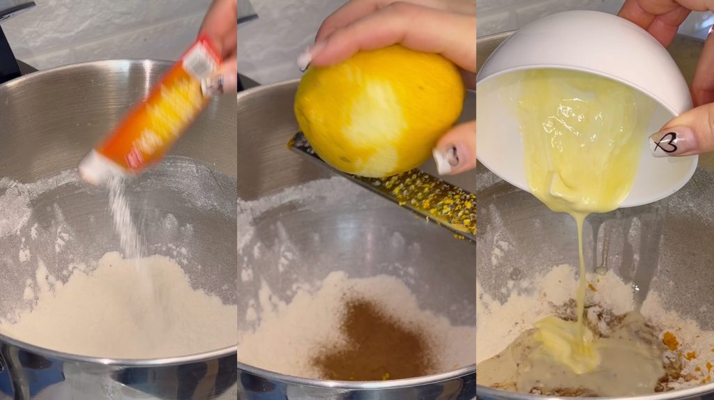 Em uma tigela, coloque a farinha, o fermento, a canela, a casca de limão e a casca de laranja. Misture bem. Adicione o leite vegetal e a margarina derretida