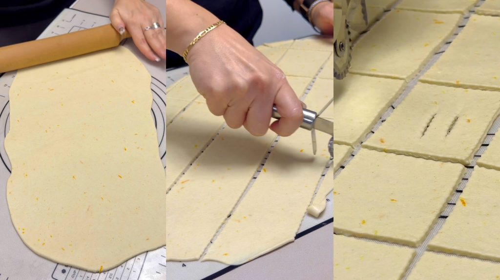Dividimos a massa ao meio e estendemos uma folha bem fina. Cortamos em retângulos e fazemos as duas incisões centrais clássicas.