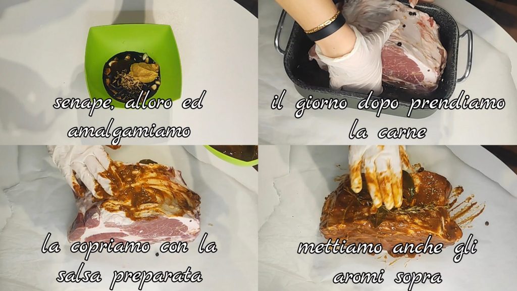 mostarda, louro e misturamos. No dia seguinte, pegamos a carne e a cobrimos com o molho preparado, massageando-a. Também colocamos os aromas por cima.
