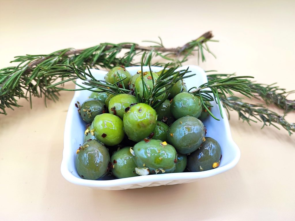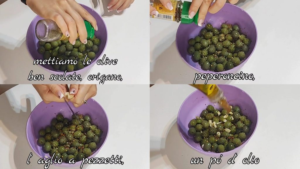 Pegamos as azeitonas, escorremos bem e depois adicionamos um pouco de orégano, pimenta, alho em pedaços, um pouco de azeite