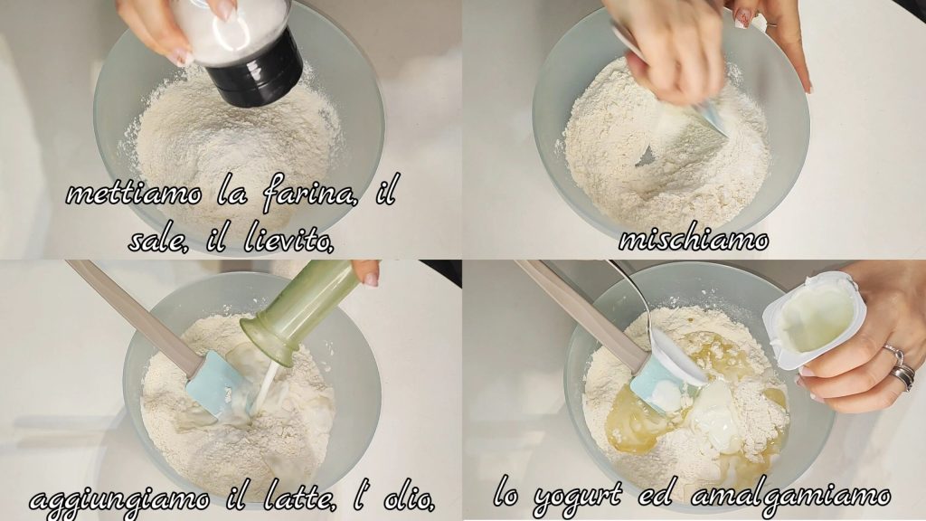 Em um recipiente coloque a farinha, o sal, o fermento e misture. Adicione o leite, o óleo, o iogurte e misture.