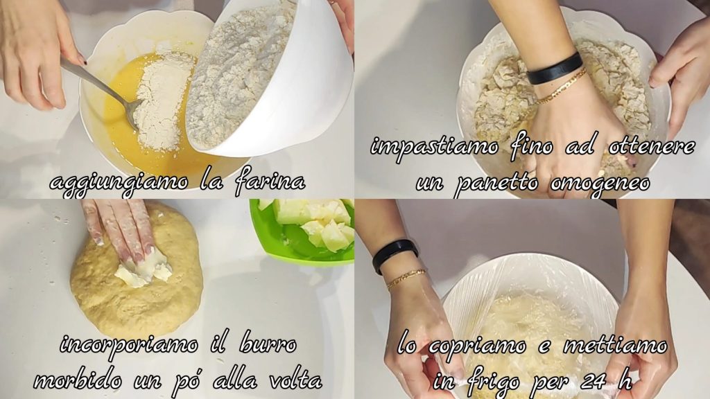 Adicionamos a farinha e sovamos até obter uma massa homogênea. Colocamos a manteiga em temperatura ambiente aos poucos e deixamos incorporar. Cobrir a massa e colocá-la na geladeira por cerca de 24 horas.