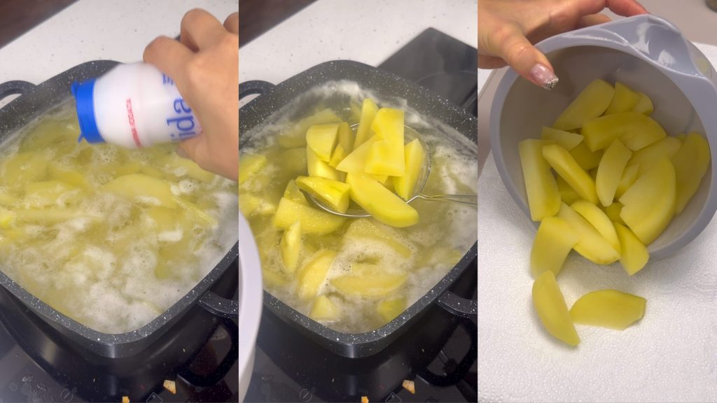 Coloque as batatas em uma panela com água e uma colher de chá de bicarbonato.