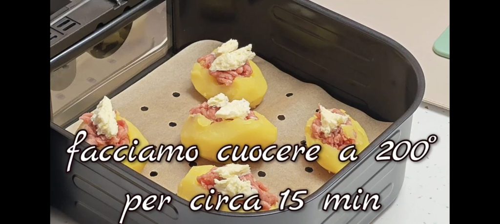 Uma receita muito simples de preparar em poucos minutos na fritadeira a ar. Enchi as batatas previamente cozidas com carne e queijo, o resultado final foi extraordinário! Essas batatas são perfeitas como entrada ou como prato principal. Escolhi fazer o cozimento na fritadeira a ar porque tinha uma quantidade pequena, mas se você não tiver a fritadeira ou quiser preparar uma quantidade maior, pode assá-las no forno.
