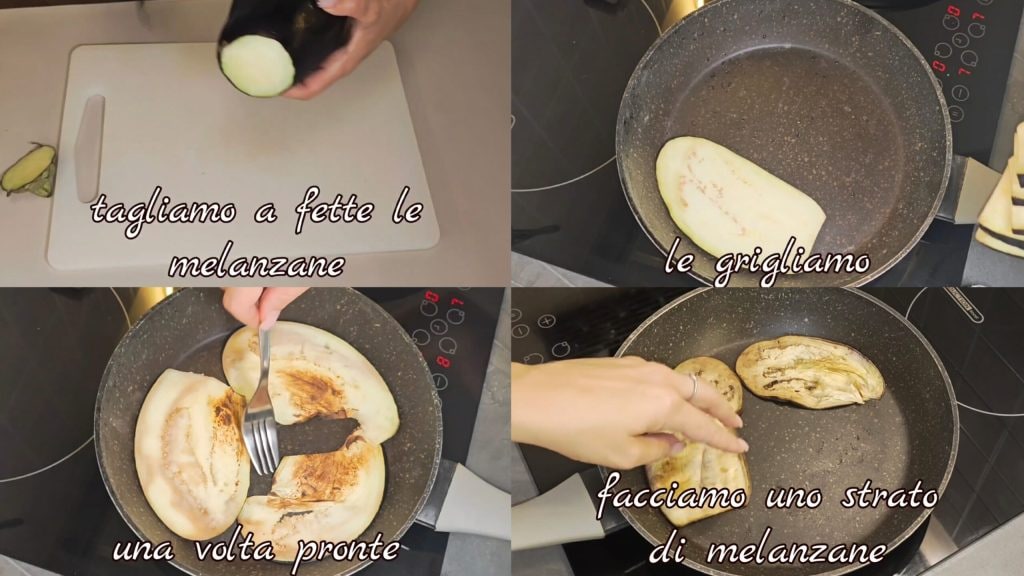 Cortamos a berinjela em fatias e as grelhamos. Uma vez grelhadas, começamos a montar nossa parmegiana. Em uma panela, colocamos uma camada de berinjelas grelhadas,