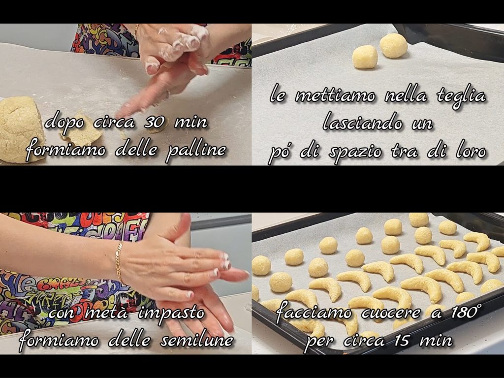 Após cerca de 30 min, pegamos um pouco de massa por vez e formamos bolinhas, colocando-as na assadeira, deixando espaço entre elas. Com metade da massa, formamos meia-luas. Assamos a 180°C por cerca de 15 min.