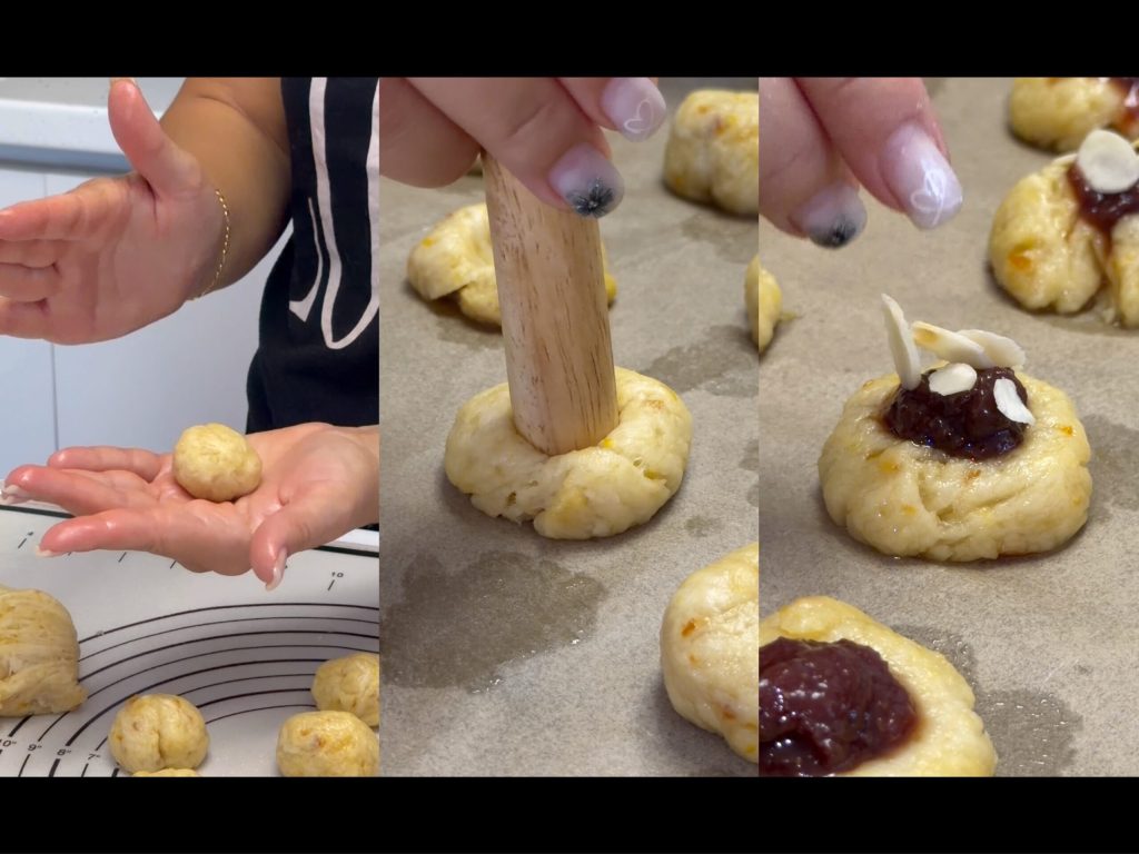 forme bolinhas e faça um pequeno buraco central. Coloque um pouco de geleia no centro.